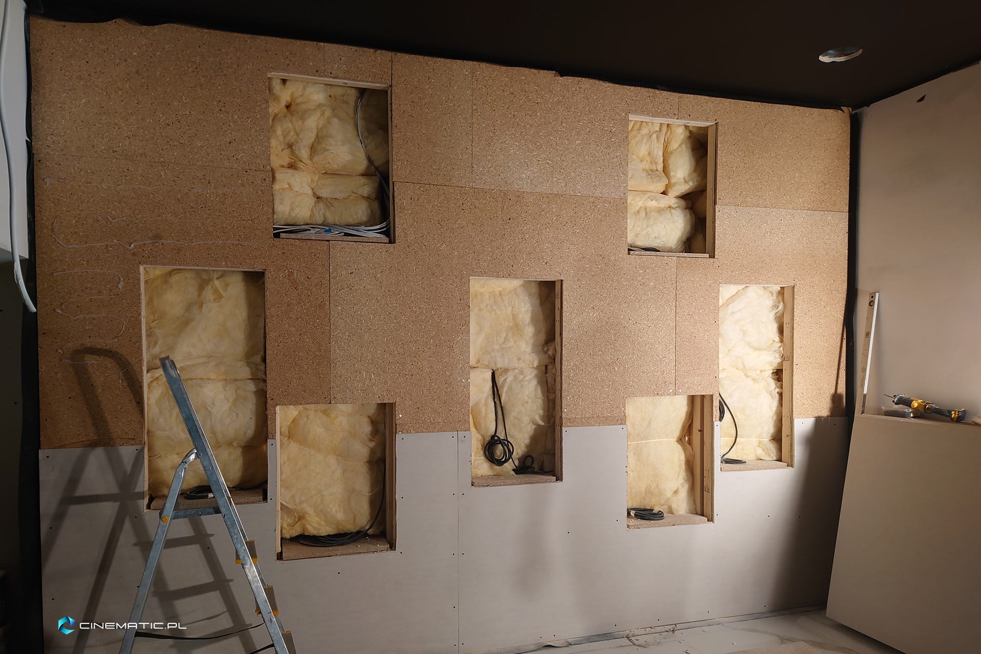 Ściany w naszym showroomie zostały zaprojektowane z myślą o połączeniu estetyki i zaawansowanej inżynierii akustycznej. Konstrukcja oparta na drewnianych stelażach, na których napięta jest tkanina akustyczna, zapewnia doskonałą przepuszczalność dźwięku. Za tkaniną ukryte są zarówno głośniki, jak i ustroje akustyczne, które odpowiednio odbijają, pochłaniają lub rozpraszają fale dźwiękowe. Dzięki temu rozwiązaniu, wnętrze zachowuje spójną estetykę, a kolor tkaniny można dostosować do projektu aranżacji, dbając jednocześnie o optymalizację akustyki pomieszczenia. Tkaniny akustyczne idealnie współgrają z trójwymiarowymi tapetami zainstalowanymi w pobliżu ekranu, tworząc harmonijną i funkcjonalną całość.